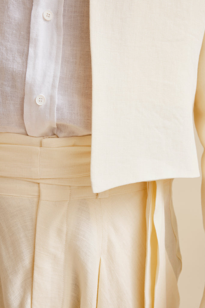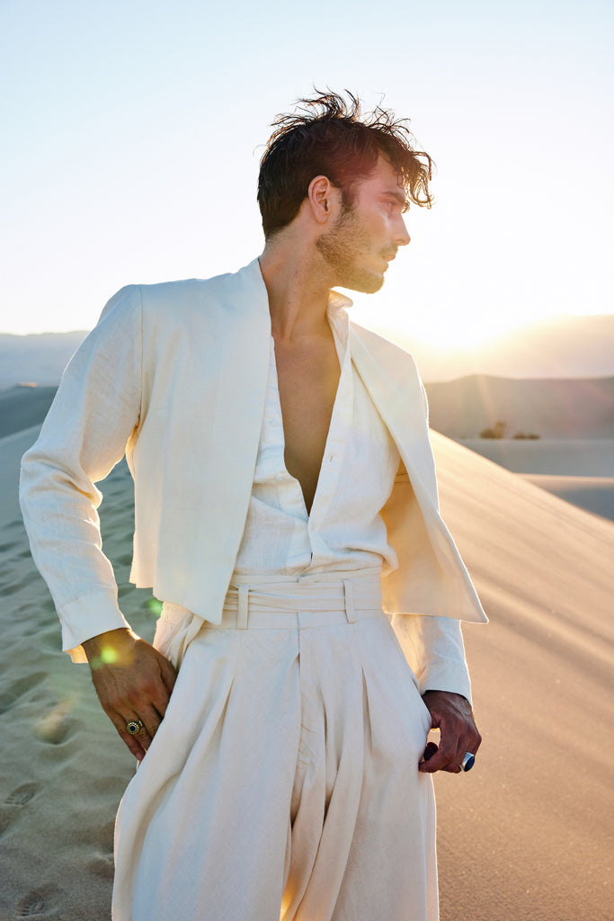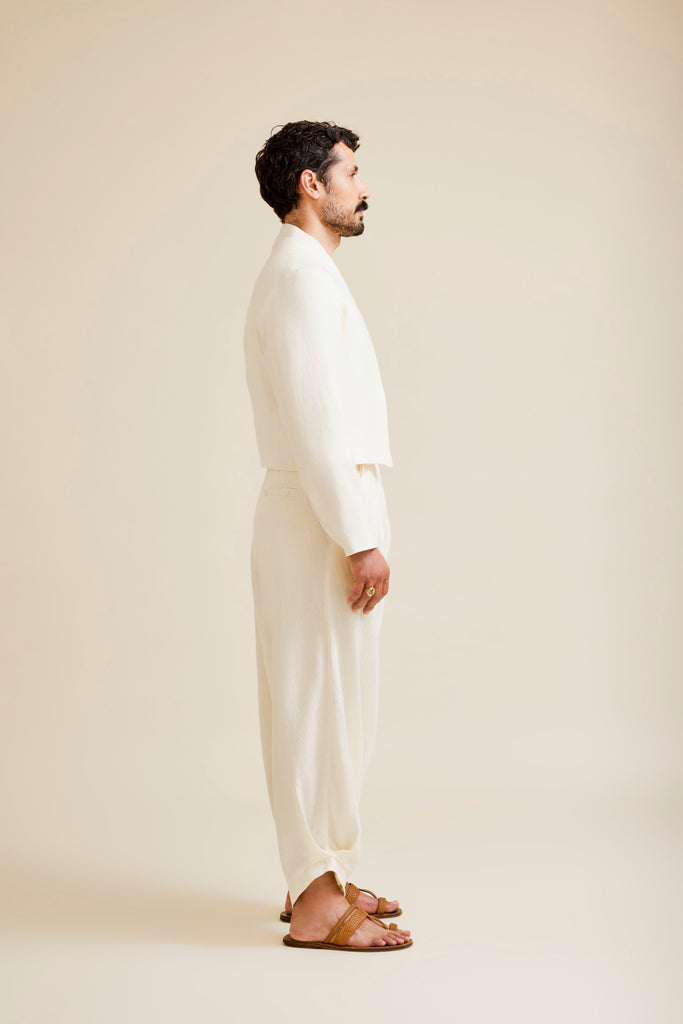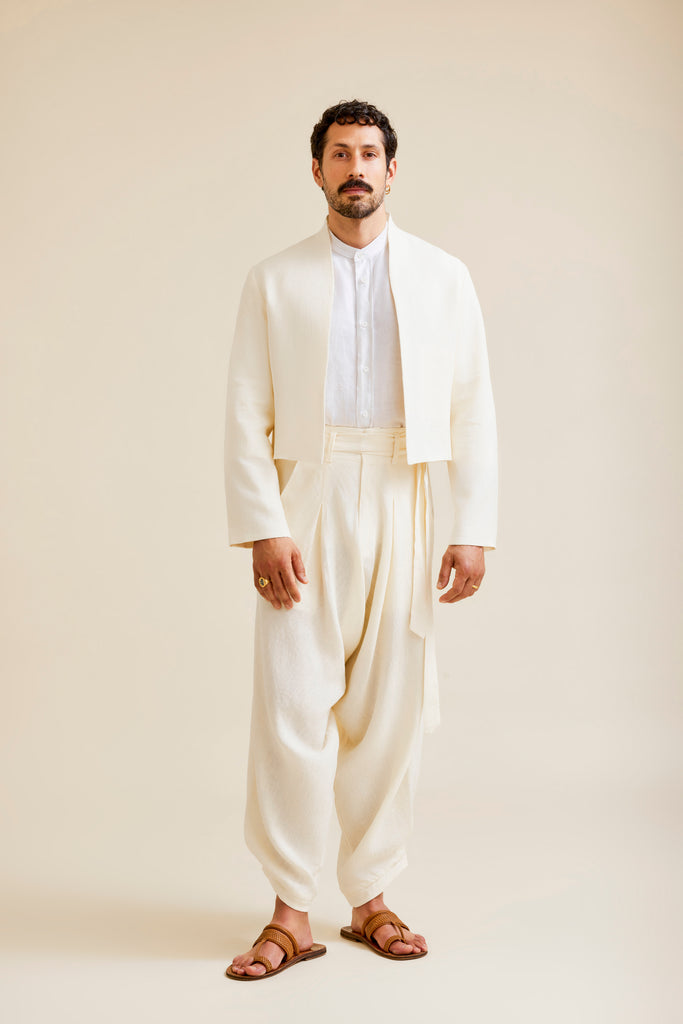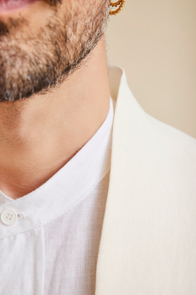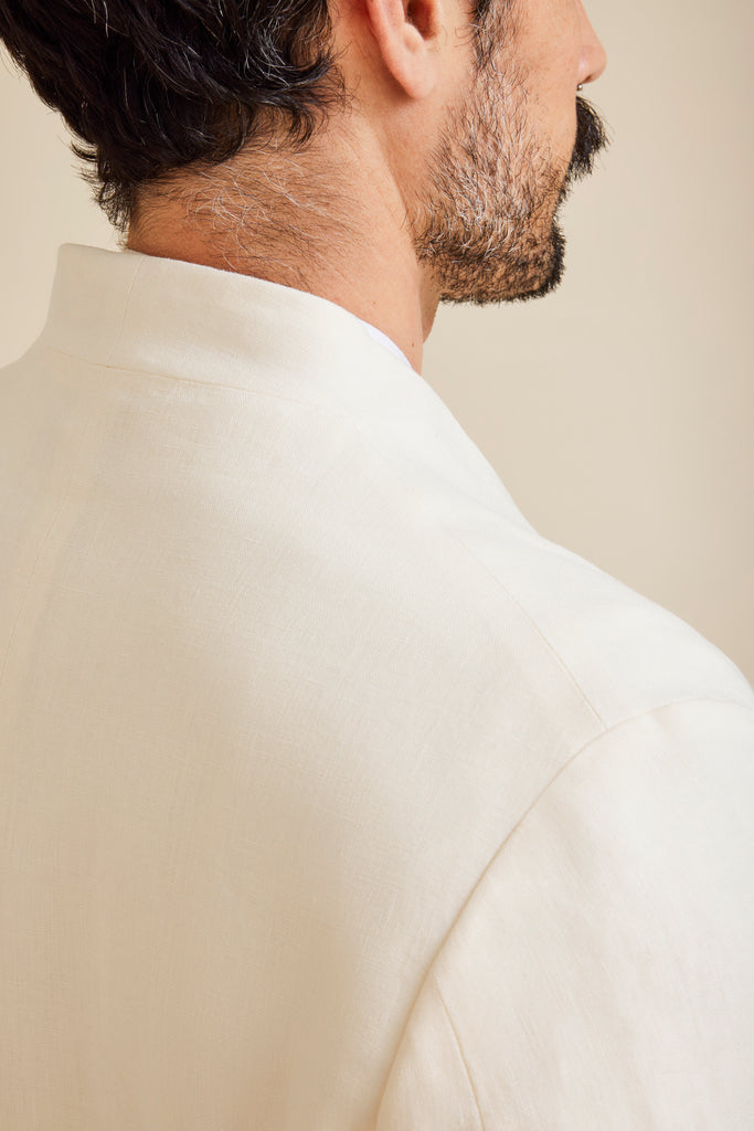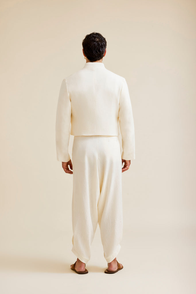 Inspired by the mystique of Iberia, this cropped, bolero-style jacket caters to men who are unafraid to express their highest self. The collarless design with a raised neckline imparts a unique silhouette, marrying traditional elegance with contemporary flair.