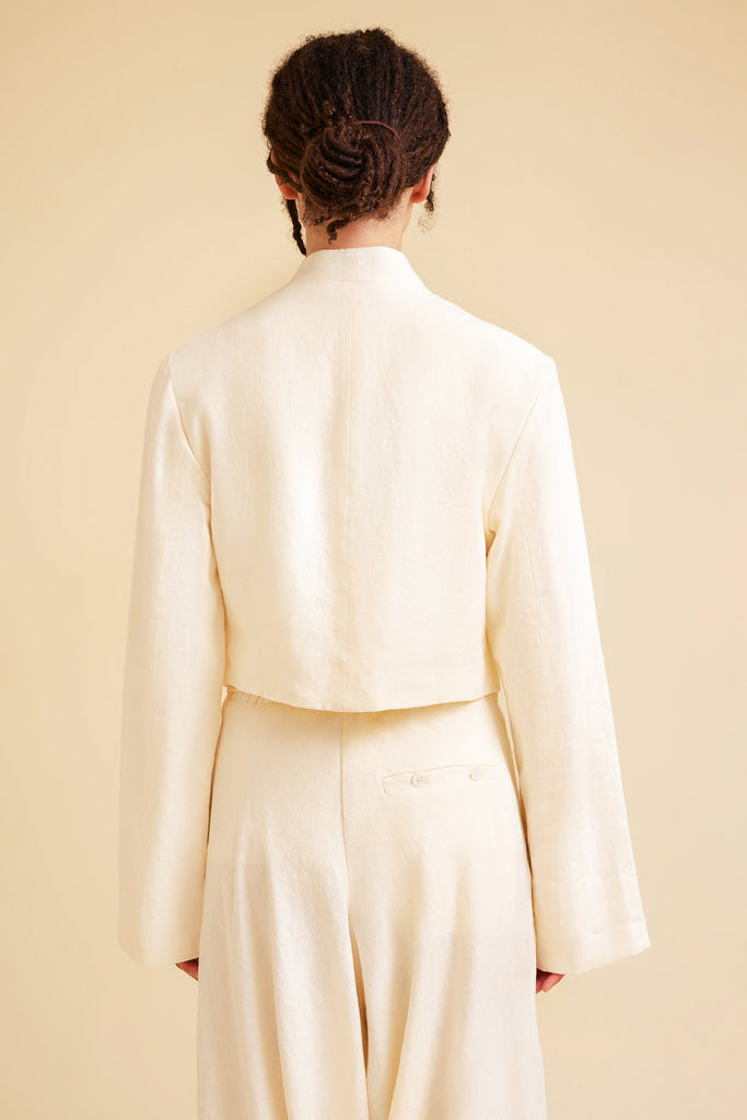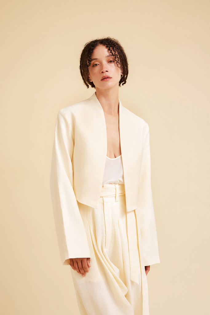 A refined expression of modern minimalism, the Petra Jacket is crafted from 100% luxurious Hemp, self-lined in our signature ivory hue. Its clean, structured silhouette features a high, minimalist collar that frames the neckline with architectural precision. The subtly flared sleeves, widening towards the cuffs, introduce a graceful flow that evokes a sense of quiet sophistication, adding a unique touch to the jacket’s otherwise sleek design. Perfect for both formal and casual settings, the Petra Jacket is an embodiment of timeless elegance and contemporary versatility, destined to become a cornerstone of the modern wardrobe.